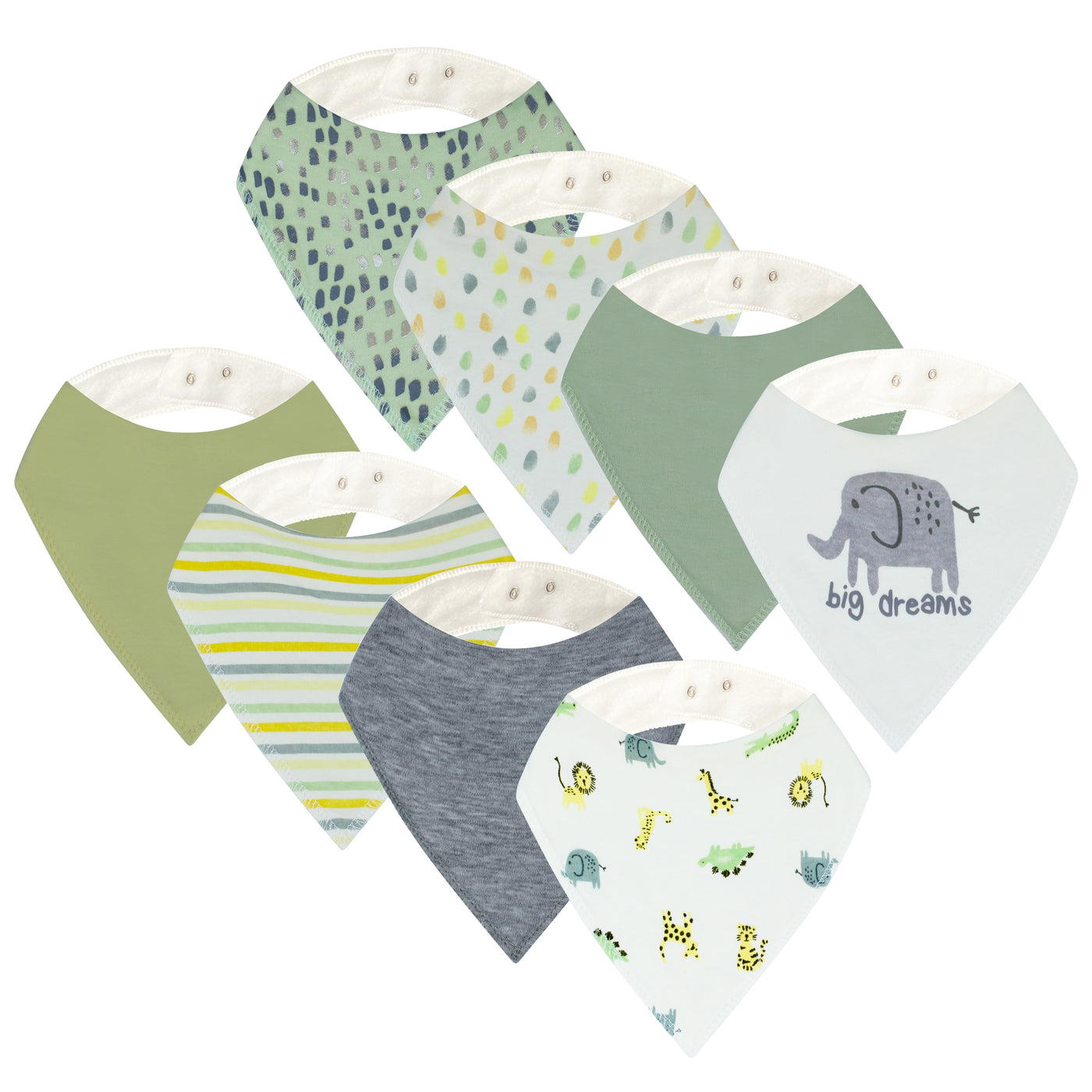 - 8 PACK SUPER CUTE DESIGN: Each Cloth Bib Set Features A Cute Coordination Of Solid & Printed Styles. Easy To Match Up to Your Little Ones Outfit.
